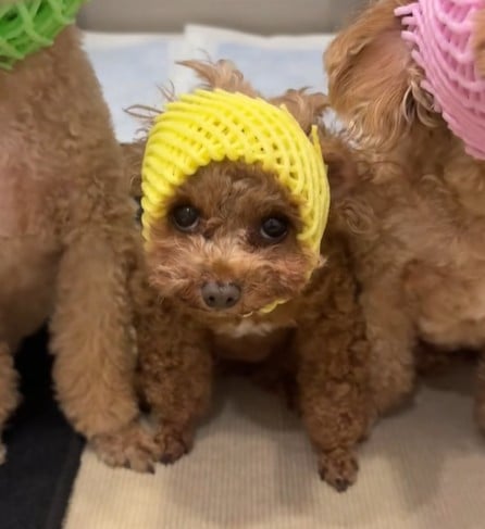 フルーツネット姿の5匹5色トイプー 様子のおかしい1匹に「ブチギレてそうな顔可愛すぎ」「犬のこういう顔好き」