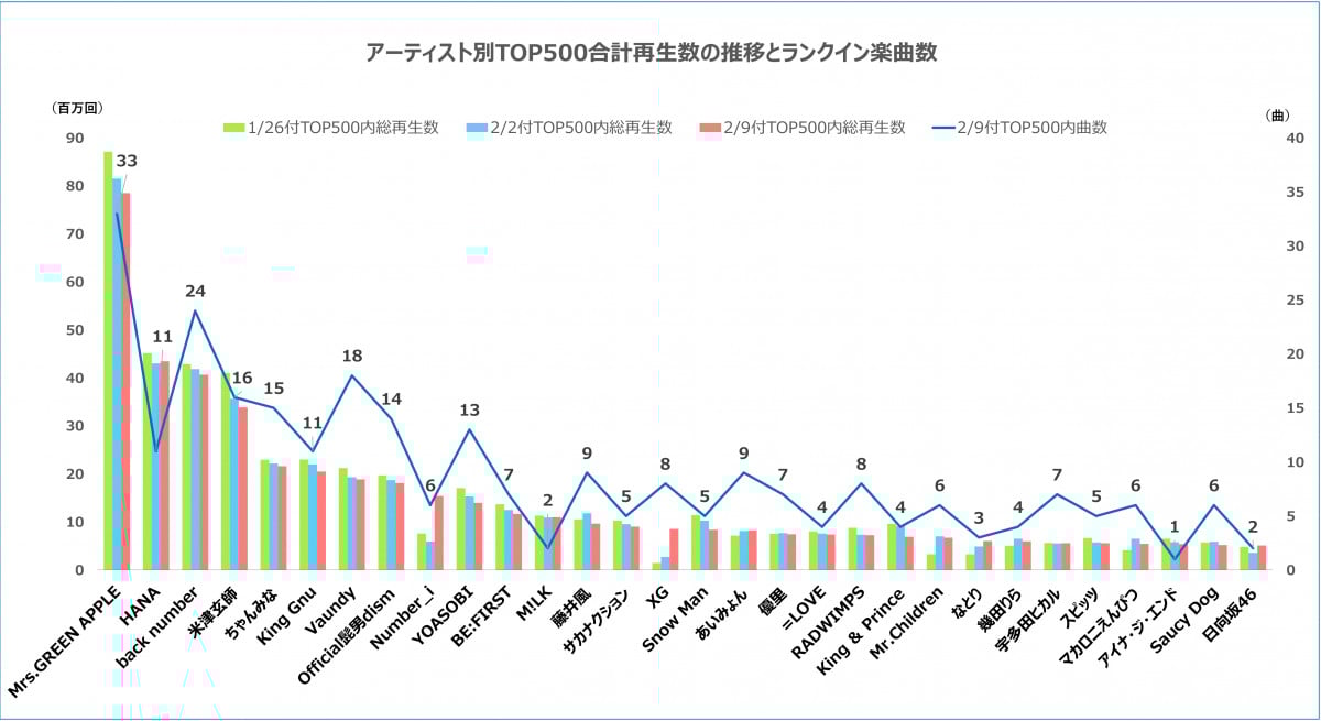 【グラフ】最新版アーティスト別TOP500合計再生数の推移とランクイン楽曲数 (3/13枚)