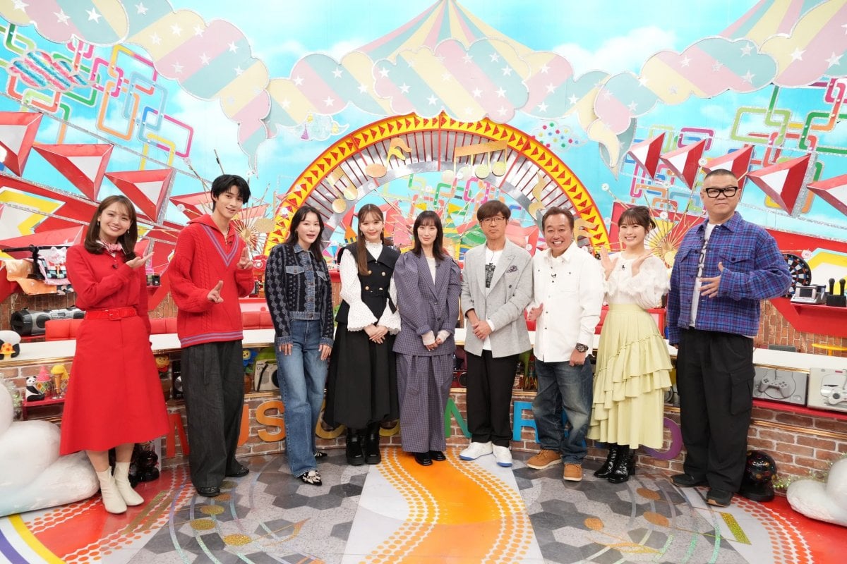 『ミュージックジェネレーション』に出演する(左から)井上清華(フジテレビアナウンサー)、曽野舜太、花山瑞貴、藤田ニコル、坂下千里子、さまぁ〜ず(大竹一樹、三村マサカズ)、渋谷凪咲、長谷川忍(シソンヌ)(C)フジテレビ (2/6枚)