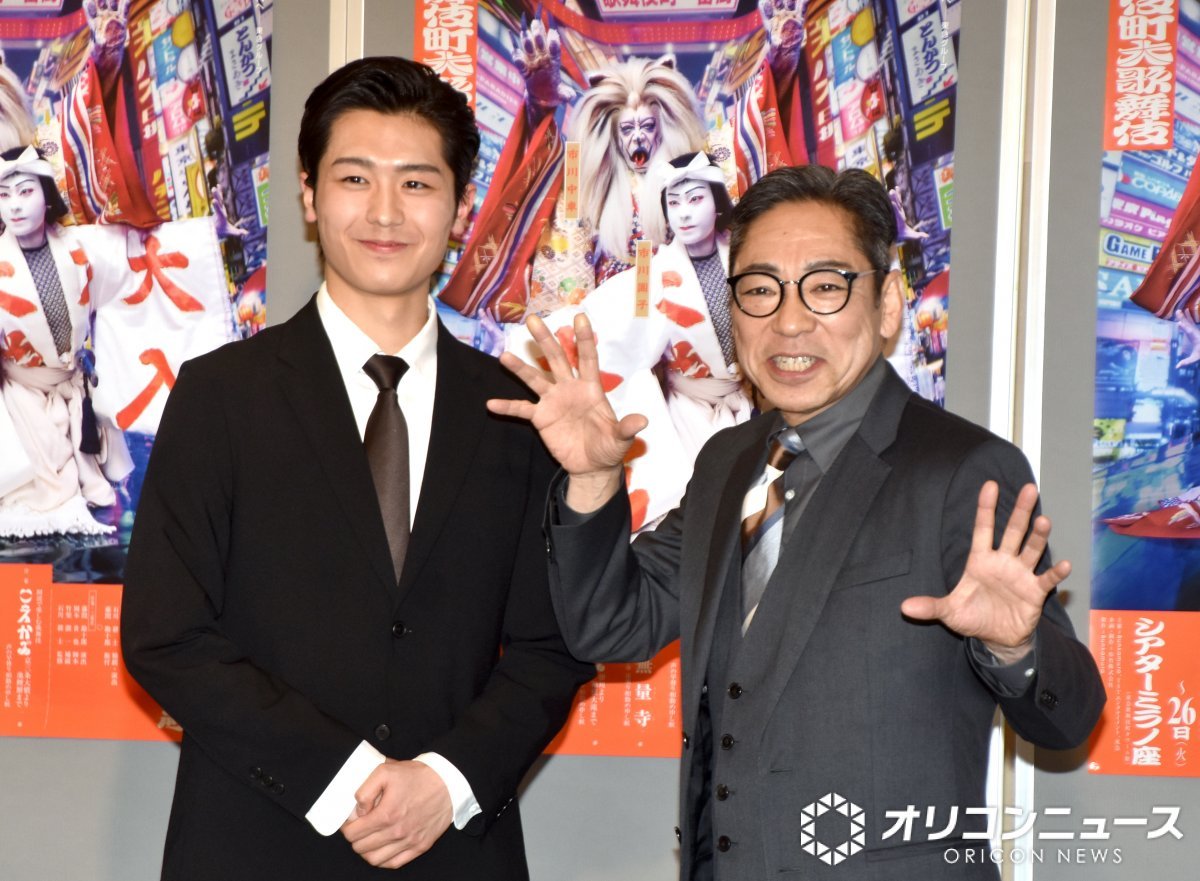 歌舞伎町大歌舞伎三代猿之助四十八撰の内『獨道中五十三驛』製作発表会見に参加した(左から)市川團子、市川中車 (C)ORICON NewS inc. (7/10枚)