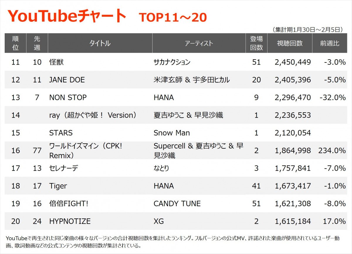YouTubeチャートTOP20(集計期間:2026/1/30〜2026/2/5) (2/3枚)
