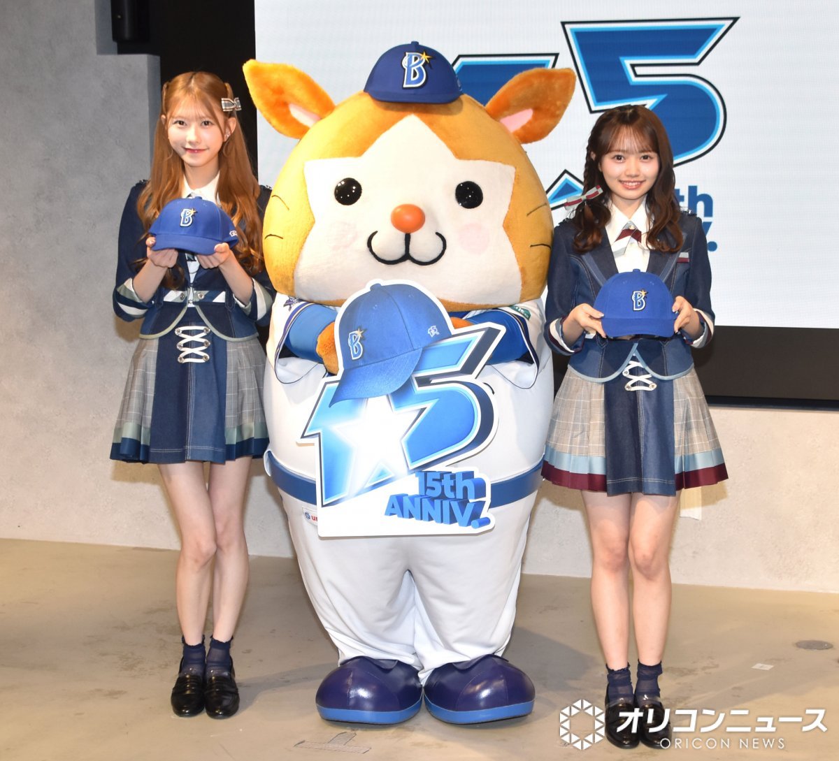 横浜DeNAベイスターズ「15th MEMORIAL CAP」寄贈発表会に登壇した(左から)千葉恵里、DB.スターマン、花田藍衣 (C)ORICON NewS inc. (2/4枚)