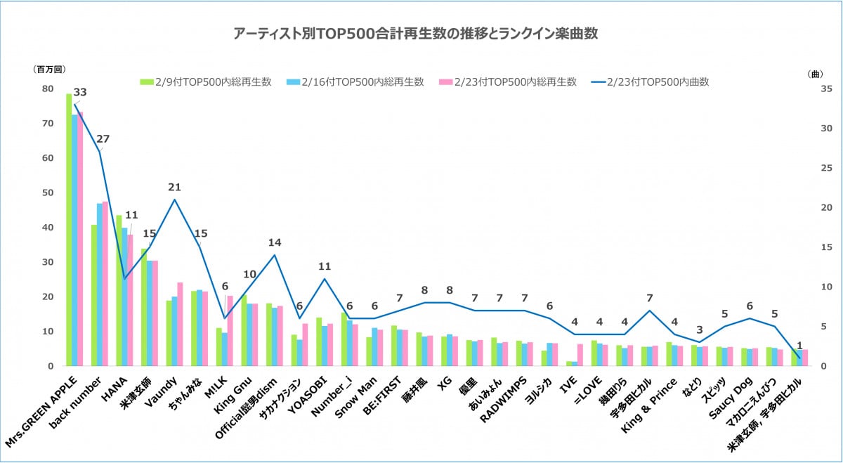 【グラフ】最新版アーティスト別TOP500合計再生数の推移とランクイン楽曲数 (3/11枚)