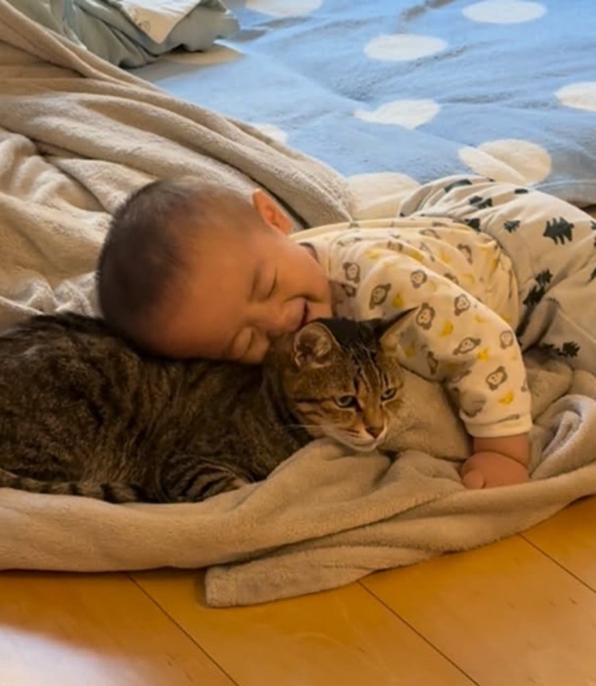 赤ちゃんからの“重すぎる愛”を受け止める猫…習性の「すりすり」を"される”側に「いつも子守りありがとうございます」