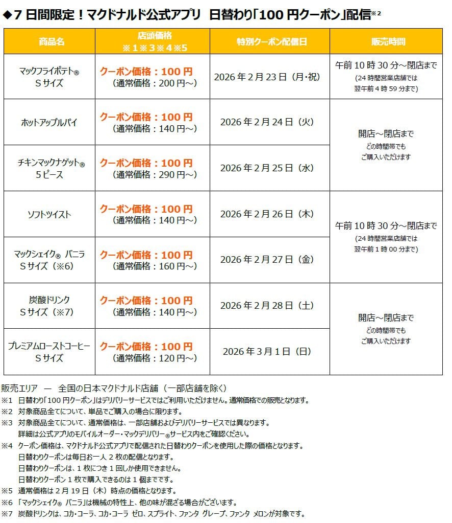 マクドナルド『トクニナルド』、100円日替わりクーポン“公式アプリ”にて配布 2・23よりナゲット&ポテトS&アップルパイほか