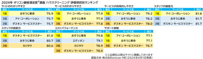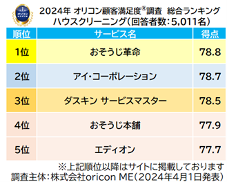 【『ハウスクリーニング』満足度調査】おそうじ革命が5年連続の総合1 位 “コスパ”を評価する声が多数