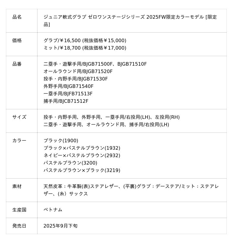 【ゼロワンステージ シリーズ】の2025FW限定カラーモデルは、一般軟式用のオーソドックスで使いやすい型を選びジュニア用にアレンジ。さらに、仕上げ加工により柔軟性もアップ。本格的なポケット形成もしやすく使いやすさを追求しました。また、グラブはS〜LLまでの4サイズ展開とし幅広いジュニア軟式プレーヤーに対応します。今回は、2025FW限定カラーモデルとして5色をラインナップしました。