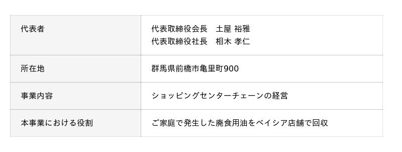 これまでベイシアでは、プラスチック容器のリサイクルやペットボトルの回収、レジ袋の削減などを通じて、リデュース・リユース・リサイクルの取り組みを進めてまいりました。この度の取り組みにおいても、全国に展開する店舗を有効な回収拠点と考え、今後は窓口となる店舗を拡大していくとともに、地域のお客様にご協力いただきながら、廃食用油のリサイクルによるBAF・SAFの普及に貢献してまいります。