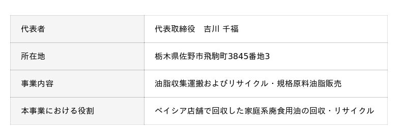 株式会社ベイシア(代表取締役社長:相木 孝仁 以下、「ベイシア」)、株式会社吉川油脂(代表取締役:吉川 千福 以下、「吉川油脂」)、および田中鉄工株式会社(代表取締役CEO:村田 満和 以下、「田中鉄工」)は、ご家庭で発生した廃食用油の回収・リサイクル事業を2025年10月10日より共同で開始することをお知らせします。