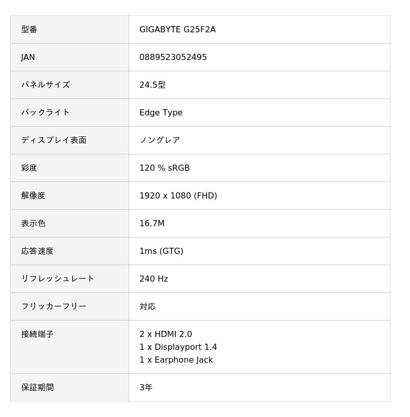 GIGABYTE G25F2A | GIGABYTE(ギガバイト) 24.5インチ FHD(1920×1080) 液晶 ゲーミングディスプレイ/モニター