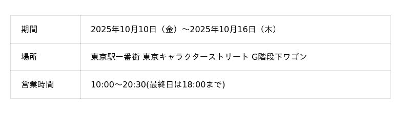 2025/10/10(金)〜2025/10/16(木) 東京駅一番街東京キャラクターストリート G階段下ワゴン