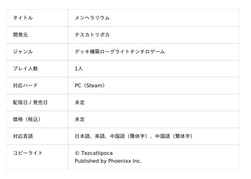 株式会社Phoenixx(フィーニックス)(東京都武蔵野市、代表取締役社長:坂本 和則)は、デッキ構築ローグライクチンチロゲーム『メンヘラリウム』について、2025年10月14日(火)〜21日(火)にSteamにて開催される「Steam Next Fest」に参加すると共に、「Steam Next Fest」に先行し、日本時間の2025年10月11日(土) 0時より、体験版を初公開することに決定いたしました。