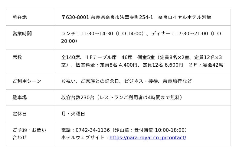 ご予約方法:奈良ロイヤルホテル公式WEBサイト または お電話 0742-34-1131