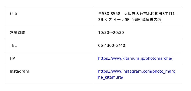 大阪市北区梅田の商業施設ルクア イーレ9Fの梅田 蔦屋書店内に2025年2月にオープンした店。同店は、2020年に開業した写真とカメラにまつわるライフスタイル提案を行う専門店「新宿 北村写真機店」がプロデュースする新ブランドで、「これからカメラや写真を始めてみたい」という初心者の方が、はじめてのマイカメラを見つけて、撮影やプリント・フォトブックの制作など、写真を楽しむ生活をサポートする。