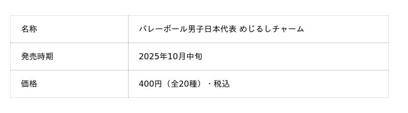 ファッション・アパレル雑貨を中心に企画・製造・販売など、国内外のブランドのOEM事業を手がけるイエロー株式会社(本社:東京都渋谷区 代表取締役:阪崎英一郎、以下「当社」)は、バレーボール男子日本代表選手をモチーフにしたカプセルトイ3商品を2025年10月中旬より順次発売いたします。