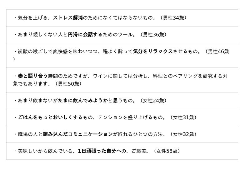 一方、お店など“外”では、「一緒に飲む人と打ち解けたい」「リフレッシュ・気分転換したい」が25%前後、「語り合いたい」が17.6%です。