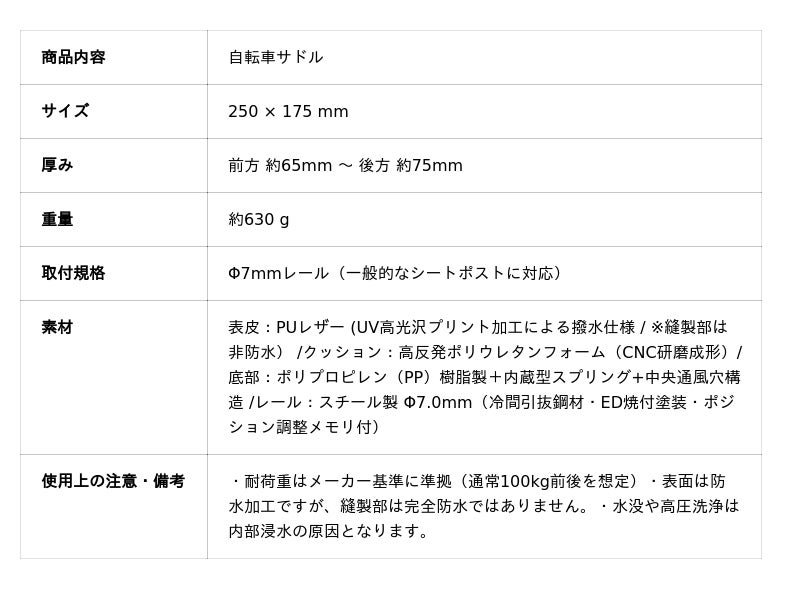 大量生産品では得られない、高い耐久性と快適な座り心地を実現した、高品質なサドルです。