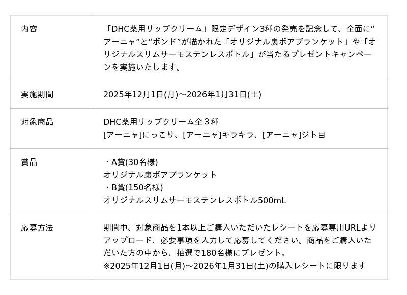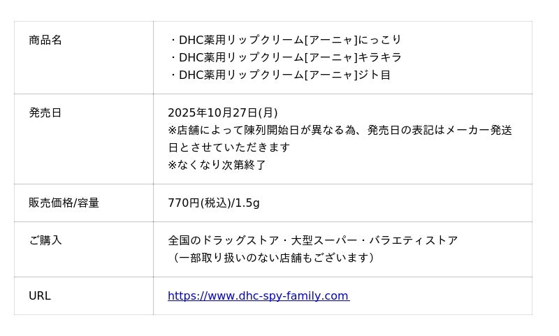 株式会社ディーエイチシー(本社:東京都港区、代表取締役社長:宮崎 緑、以下:DHC)は、今秋放送開始のTVアニメ『SPY×FAMILY』とのコラボレーション企画として、キャラクター“アーニャ”の豊かな3つの表情をあしらった限定デザインの「DHC薬用リップクリーム」を、2025年10月27日(月)より発売します。また、オリジナル賞品として、“アーニャ”と“ボンド”が全面に描かれた「オリジナルブランケット」や「オリジナルステンレスボトル」が当たるプレゼントキャンペーンのほか、TikTok動画広告も配信します。