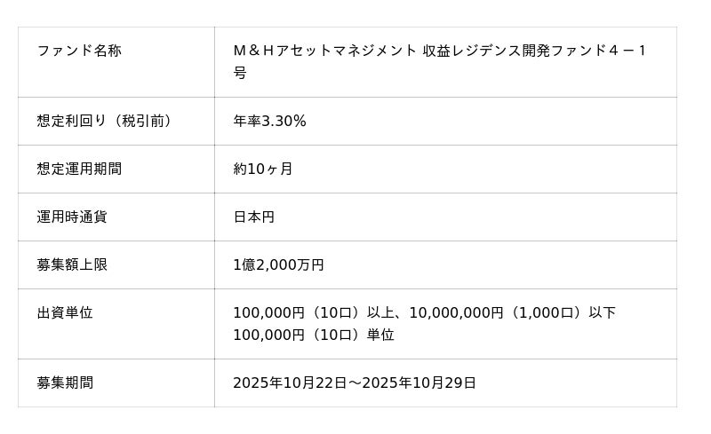 貸付型クラウドファンディング「Funvest」10/22より新ファンド「M&Hアセットマネジメント 収益レジデンス開発ファンド4-1号」の募集開始