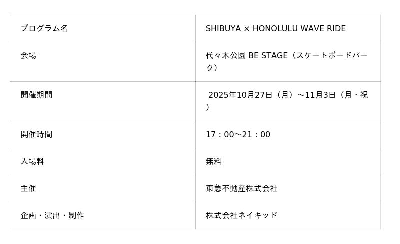 株式会社ネイキッド(英語表記:NAKED, INC.、所在地:東京都渋谷区、代表:村松亮太郎)は、渋谷区とホノルル市の姉妹都市提携(2024年5月締結)を記念し、ネイキッドがプロデュースする新たな文化交流プログラムを2025年10月27日(月)〜11月3日(月・祝)まで無料で開催します。代々木公園BE STAGEのスケートボードパークを舞台に、ハワイのアーティストによる作品とスケーターの動きが呼応するデジタルアート体験『SHIBUYA × HONOLULU WAVE RIDE 』を展開。都市と自然、スケートとサーフが融合するインタラクティブなプロジェクションマッピングを体験いただけます。