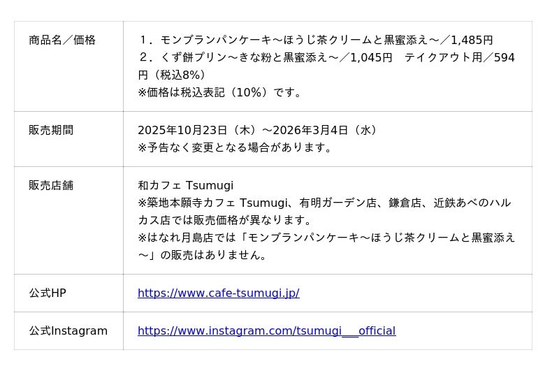 飲食チェーン「PRONTO(プロント)」を展開する株式会社プロントコーポレーション(本社:東京都港区、代表取締役社長:杉山和弘)は、『和カフェ Tsumugi(以下、ツムギ)』にて、「モンブランパンケーキ〜ほうじ茶クリームと黒蜜添え〜 」と「くず餅プリン〜きな粉と黒蜜添え〜 」を2025年10月23日(木)より発売いたします。