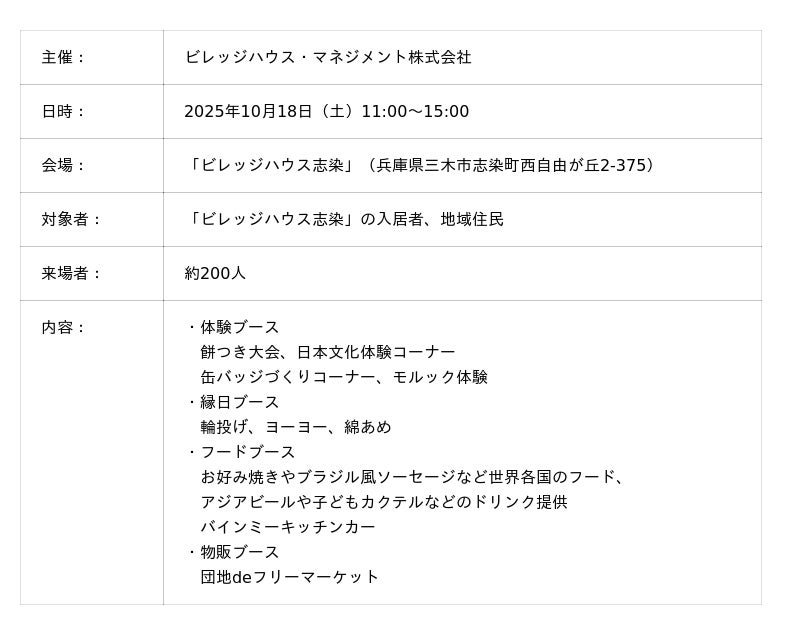 ビレッジハウス・マネジメント株式会社(本社:東京都港区、代表取締役社長兼CEO:岩元 龍彦、以下ビレッジハウス)は、兵庫県三木市にある「ビレッジハウス志染」で、地域住民や入居者を対象に、外国人入居者との相互理解と交流を深めることを目的とした「ビレフェスin 志染」を2025年10月18日(土)に開催しました。ビレッジハウスは2019年からコミュニティイベントや防災イベントを全国各地で開催しており、兵庫県三木市では初の実施です。