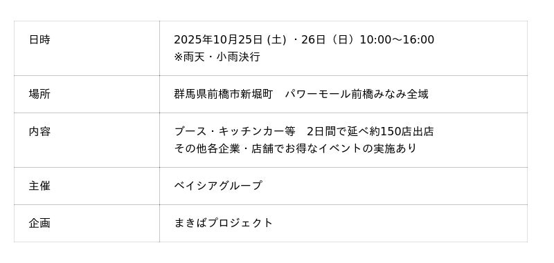 株式会社ベイシア(本社:群馬県前橋市、代表取締役社長:相木孝仁)は、10月25日(土)・26日(日)の2日間、群馬県前橋市新堀町にある「パワーモール前橋みなみ」全域にて、ベイシアグループ主催の「第1回 前橋みなみ パワーモールフェス」を開催いたします。本イベントでは、モール内各店舗によるお得な企画のほか、キッチンカーや多彩なブースの出店、さらにクラフトマーケットの開催など、2日間で延べ約150店が集結する大規模な催しです。地域とモールが一体となって盛り上げる2日間、ぜひご来場ください。