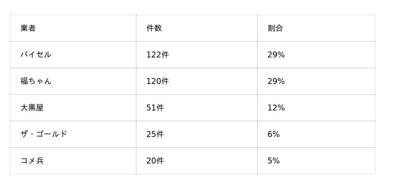 - ・バイセルと福ちゃんの2社で過半数を占めている