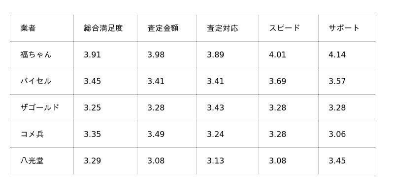 一方、福ちゃんは専門スタッフによる丁寧な査定・接客が評価され「安心して任せられる」という声が多く見られました。