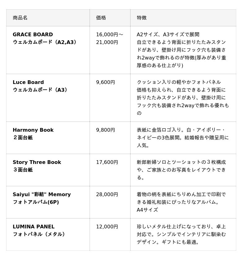 今回のラインアップには、オリジナルウェルカムボード、フォトアルバム、フォトパネル、2面台紙、3面台紙が新登場。