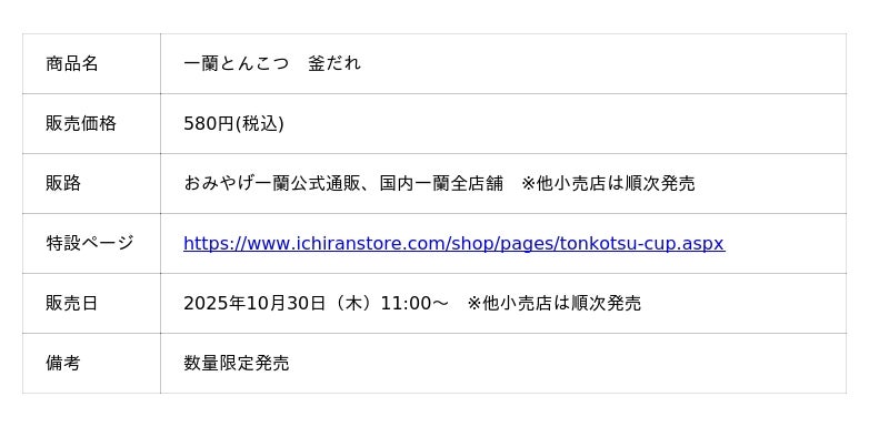 株式会社一蘭は、2025年10月30日(木)11時より、おみやげ一蘭公式通販、全国の一蘭店舗で「一蘭 とんこつ 釜だれ」を新発売いたします。(※他小売店は順次発売予定)