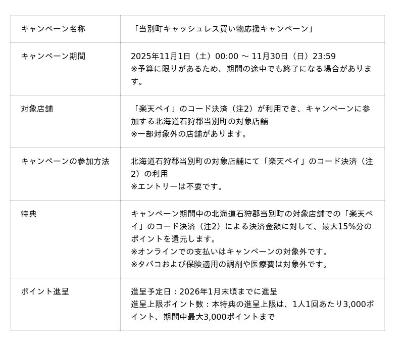 楽天ペイメント株式会社(以下「楽天ペイメント」)は、運営するキャッシュレス決済サービス「楽天ペイ」において、北海道石狩郡当別町が2025年11月1日(土)から11月30日(日)まで実施する「当別町キャッシュレス買い物応援キャンペーン」に参加することをお知らせします。