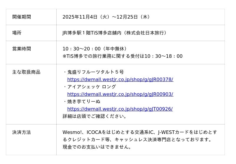 西日本旅客鉄道株式会社(本社:大阪府大阪市、代表取締役社長:倉坂 昇治、以下「JR西日本」)は、2025年11月4日(火)にJR西日本公式産直オンラインショップ「DISCOVER WEST mall」のリアル店舗を株式会社日本旅行TiS博多内(以下「TiS博多」)に期間限定でオープンし、『DISCOVER WEST Sweets Market』として主に西日本エリアの有名スイーツを福岡県民の皆様、福岡へお越しになられる皆様へ販売します。