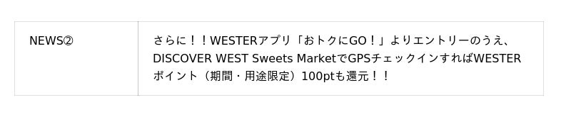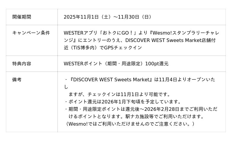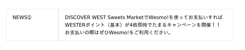 11月1日〜30日までの期間限定!!Wesmo!に会員登録するだけでWESTERポイント(期間・用途限定)1,000ptもらえるキャンペーン『はじめるなら今がチャンスWesmo!×WESPO START CAMPAIGN』 開催。この機会にWesmo!に会員登録して、DISCOVER WEST Sweets Marketでお買い物をすることにより、お得にWESTERポイントをためていただけます。