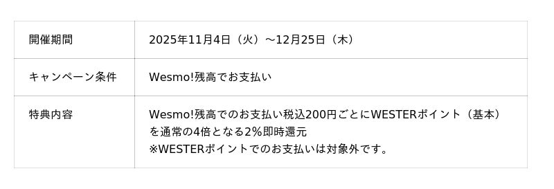 なお、店舗ではキャッシュレス決済のみ対応しており、2025年5月28日(水)からサービスを開始した「Wesmo!」も利用可能です。ブランドコンセプト「Moving is Value」が意味する「楽しい、また行きたいと感じ、人が動き、経済も動く」を体現し、「Wesmo!」を身近に感じていただけるよう、「Wesmo!」で決済いただいたお客様にWESTERポイントの還元率をアップするキャンペーンを実施します。