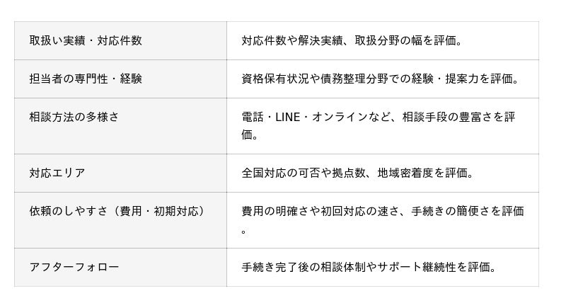 各法律事務所については、実際の相談者からの口コミと、当メディアによる独自調査を掛け合わせたランキングを掲載。評価基準の透明性を重視し、「対応スピード」「費用のわかりやすさ」「説明の丁寧さ」「信頼感」など、指標ごとの強み・弱みを明確にしました。これにより、従来のランキングありきの比較サイトでは見えづらかったリアルな評価を、ユーザー目線で再構築しています。コンテンツは定期的に更新し、新規事務所の追加やキャンペーン情報にも随時対応していきます。