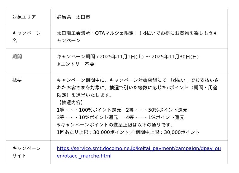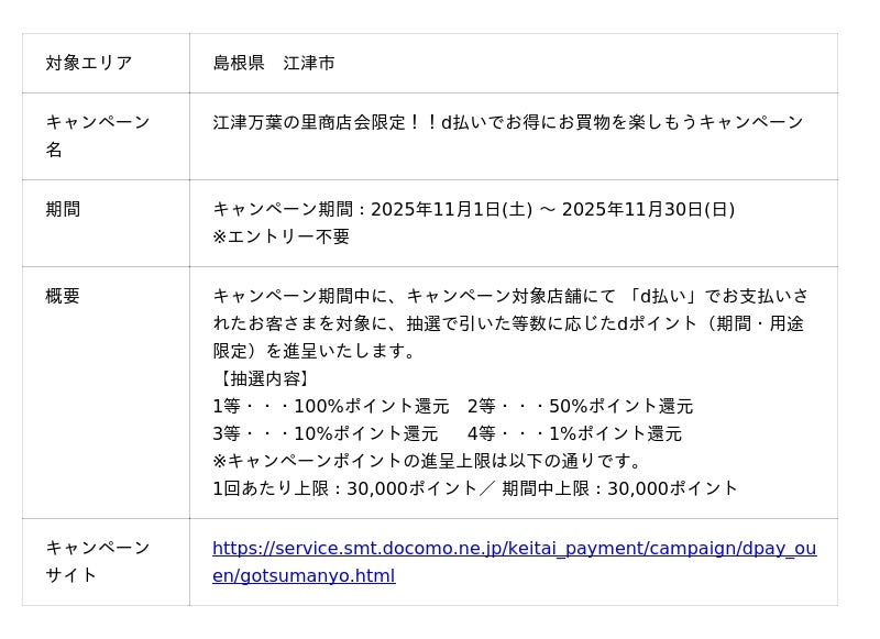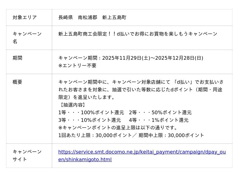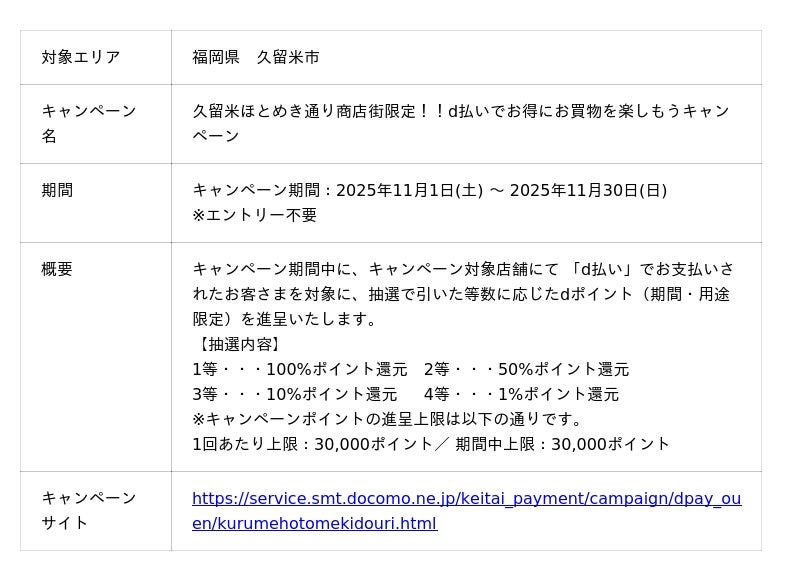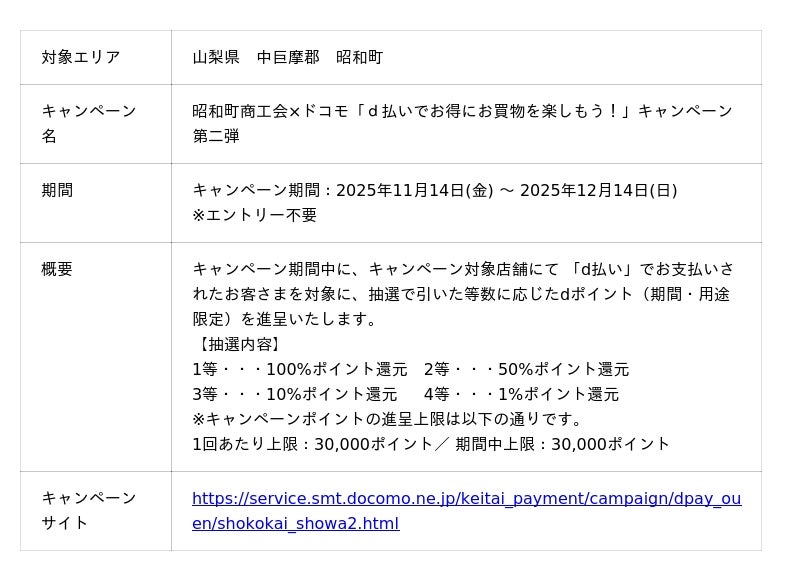 株式会社NTTドコモ(以下、ドコモ)は、全国の地域・商店街においておトクな「d払い(R)」キャンペーンを開催いたします。詳細は、下表のとおりです。