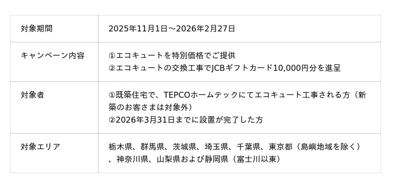 東京電力グループTEPCOホームテック株式会社(本社:東京都墨田区、代表取締役社長:青木貴洋、以下TEPCOホームテック)は、2025年11月1日から2026年2月27日までにお問い合わせをいただいた方に、エコキュートを特別価格でご提供し、さらに、エコキュートの設置または交換工事をご契約いただいた方へ、10,000円分のJCBギフトカードを進呈する「冬のエコキュートWキャンペーン」を実施いたします。
