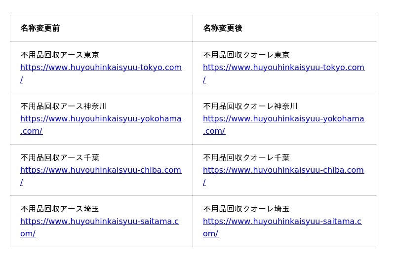 当社が東京都、神奈川県、千葉県、埼玉県を対象地域として運営する不用品片付けサービス「不用品回収アース東京」「不用品回収アース神奈川」「不用品回収アース千葉」「不用品回収アース埼玉」の名称を、2025年11月4日よりそれぞれ「不用品回収クオーレ東京」「不用品回収クオーレ神奈川」「不用品回収クオーレ千葉」「不用品回収クオーレ埼玉」に変更いたします。