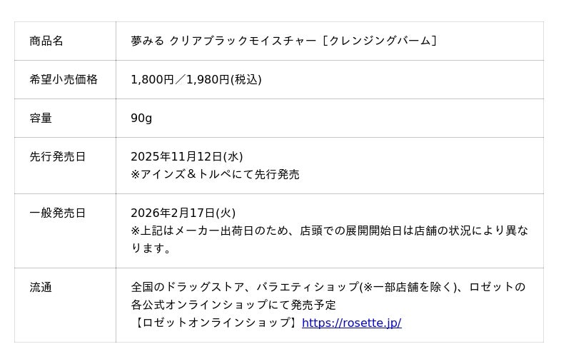 ロゼット株式会社(本社:東京都品川区、代表取締役社長:藤井 敬二)は、クレンジングブランド『夢みる』から、角栓・毛穴詰まりをケアするクレンジングバーム「夢みる クリアブラックモイスチャー」を、アインズ&トルペにて2025年11月12日(水)より先行発売、2026年2月17日(火)より全国のドラッグストア、バラエティショップ(※一部店舗を除く)などで順次販売を開始いたします。