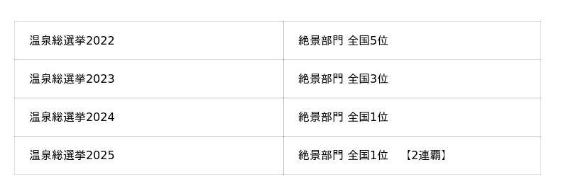 5省庁(環境省、内閣府、総務省、経済産業省、観光庁)の後援で温泉地のランキング企画を実施している温泉総選挙2025で5万275人の応援投票にて選ばれた全国ランキング絶景部門において全国1位を獲得した。