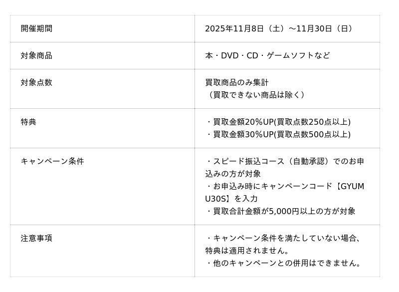 株式会社ブックサプライ(本社:大阪府吹田市、代表取締役:藪田真吾)は、2025年11月8日(土)〜11月30日(日)の期間限定で、「売るほど高く売れる!買取金額最大30%UPキャンペーン」を開催いたします。