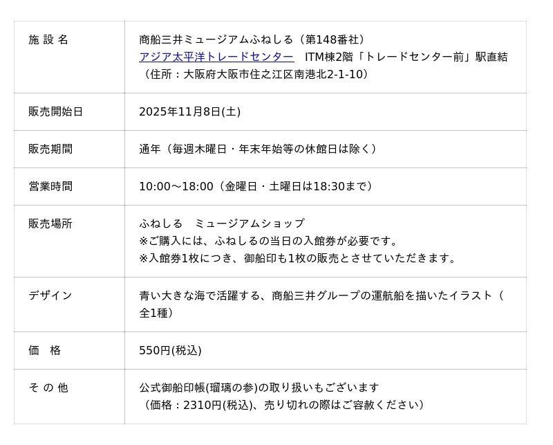 商船三井ミュージアム「ふねしる」(註1)は、神社仏閣めぐりで集められる御朱印の船バーションである「御船印(ごせんいん)プロジェクト(註2)」に参画し、2025年11月8日(土)より、オリジナル御船印の販売を開始します。