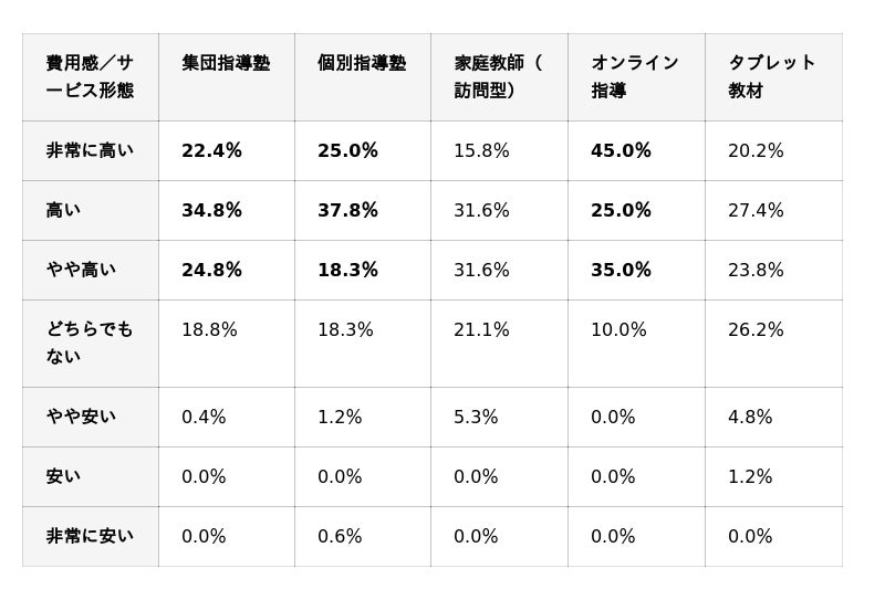 ただし、「非常に高い」「高い」の2項目では、個別指導塾が集団指導塾を上回ります。一般的にいわれるとおり、「個別指導塾は予想通り高かった」「家計への影響が大きかった」と感じる保護者が多いようです。