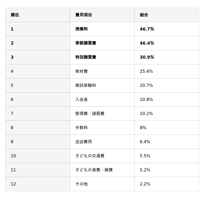これらの結果から、塾の費用には「想定外」の項目があること、“その時”になってみないと費用が確定しない項目があると押さえておくことが重要だとわかります。