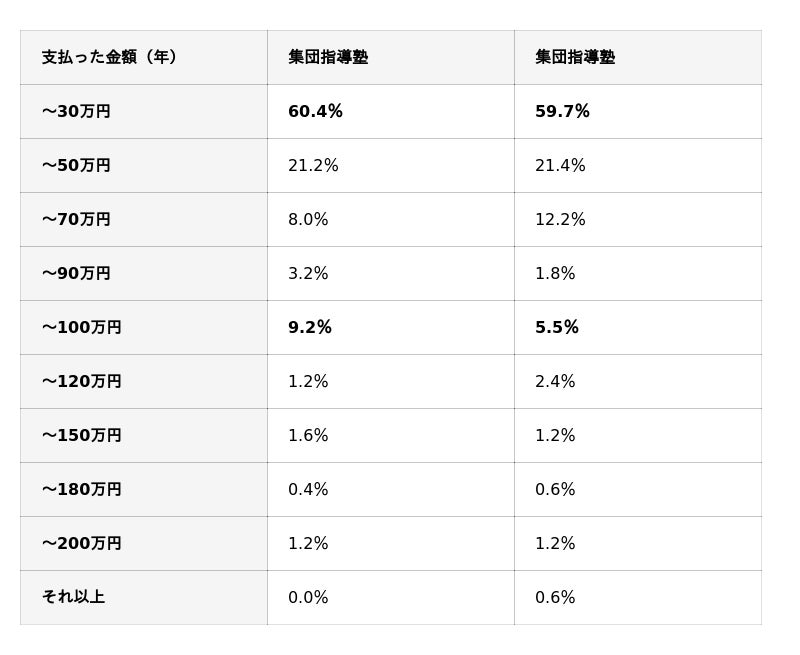ボリュームゾーンは、どちらの塾形態も「年間30万円まで」となっています。年間30万円は、1か月平均2.5万円。一般的な個別指導塾で1〜2教科を受講した月謝に相当します。