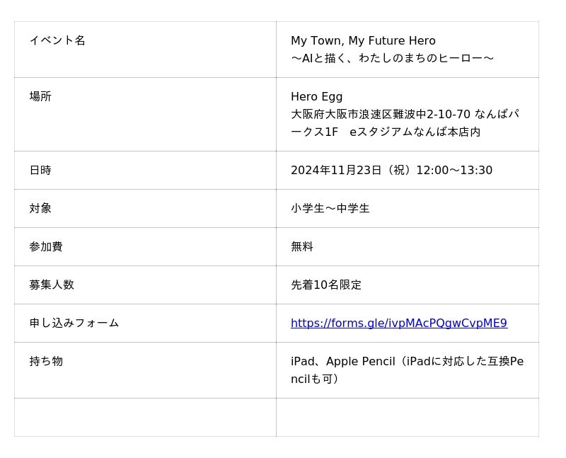 株式会社Meta Heroes(本社所在地:大阪府大阪市、代表取締役:松石和俊、以下「当社」)は、当社が運営するDX教育施設「Hero Egg(ヒーローエッグ)」(大阪・なんばパークス内)にて、元Apple米国本社副社長で、iPod miniの大ヒット仕掛け人として知られる前刀 禎明(さきとう よしあき)氏をお招きし、子どもの創造性を育む特別ワークショップ「My Town, My Future Hero 〜AIと描く、わたしのまちのヒーロー〜」を、2024年11月23日(祝)に無料開催します。