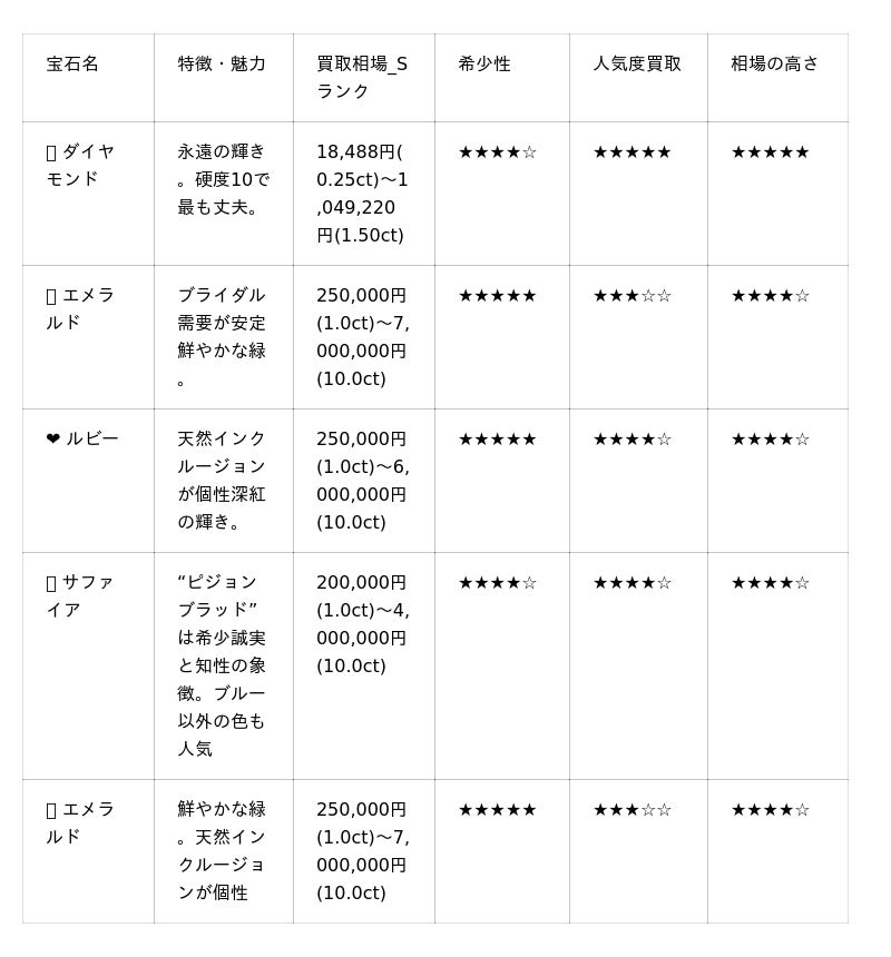 以下は、リユース市場でも人気の高い宝石5種を比較した参考データです。