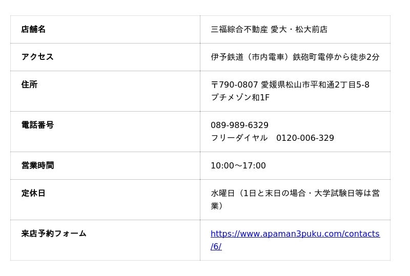 三福綜合不動産 愛大・松大前店は、愛媛県松山市近辺の賃貸マンション・アパートを中心に、学生向け物件を多数取り扱う不動産総合サービス店舗です。松山大学正門・愛媛大学裏門から徒歩5分の立地にあり、毎年多くの新入生・保護者の皆さまにご利用いただいています。