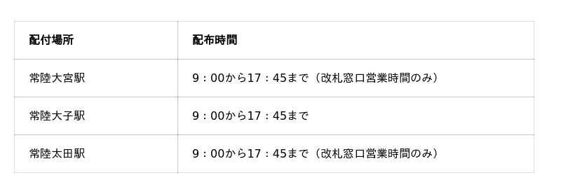 JR水郡線降車時に各駅の駅員にお声がけください。お一人につき1本をお渡しします。